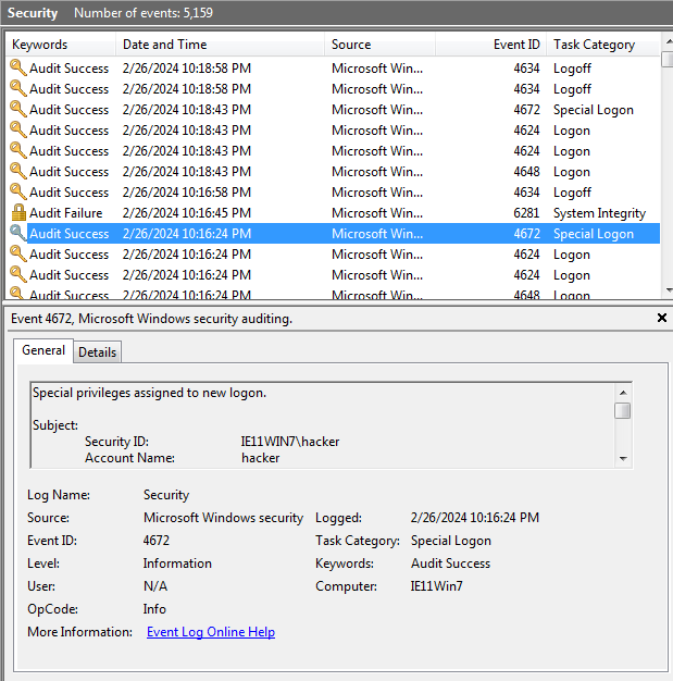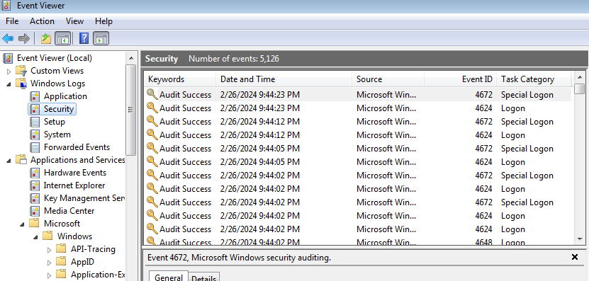 Windows Logs > Security로 들어가면, 로그인 및 권한 변경 정보가 나온다.