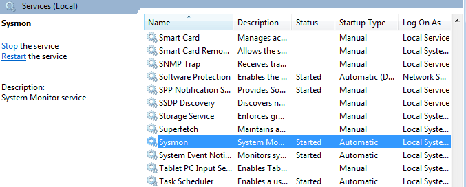 설치하면 Sysmon이 서비스에 등록된 것을 확인할 수 있다.