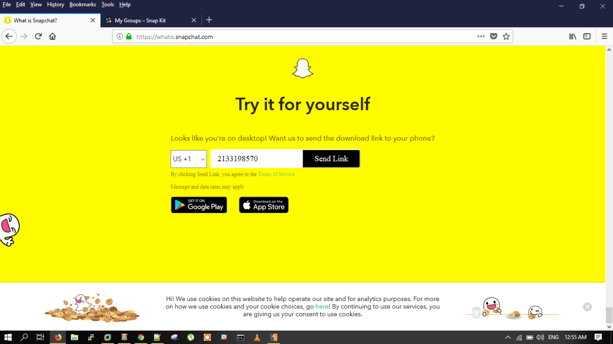Snapchat 홈페이지에서 Snapchat을 추천하고 싶은 사람의 전화번호를 입력하면, 그 사람의 SMS로 Snapchat 다운로드 링크가 포함된 메시지가 전송되었다.