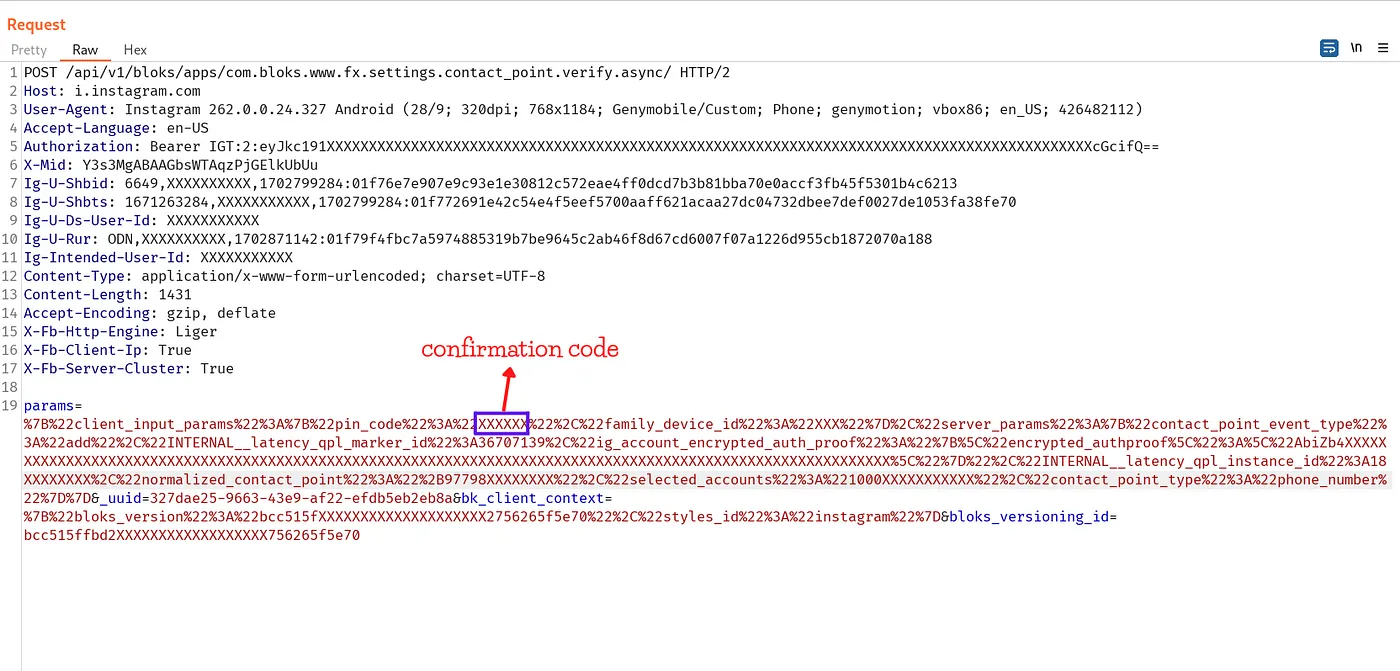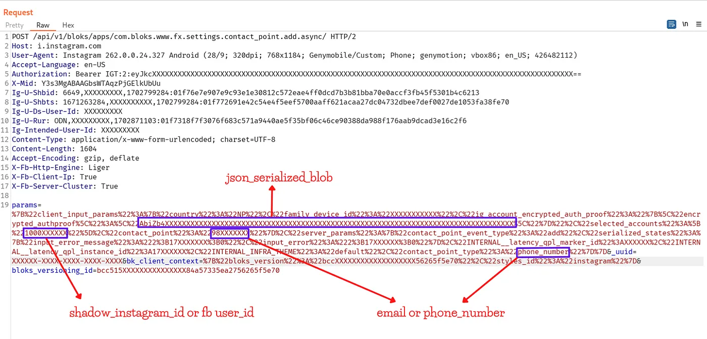 페이스북은 해당 토큰을 가지고 다시 /api/v1/bloks/apps/com.bloks.www.fx.settings.contact_point.add.async/로 POST 요청을 전송하며, 해당 요청을 캡쳐하여 다시 분석해본다.