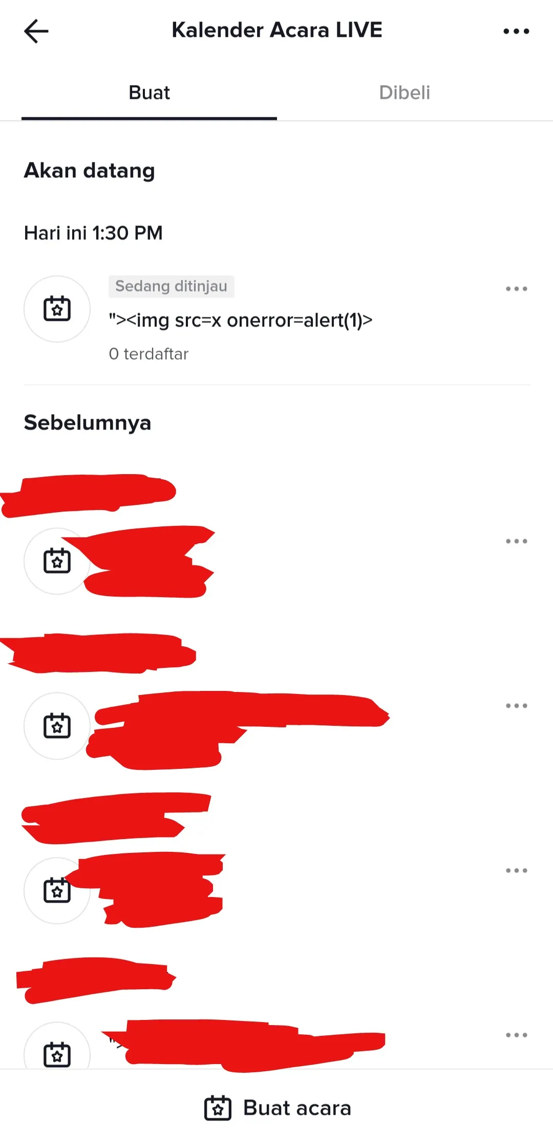 라이브 이벤트의 제출 form 상에서 XSS가 동작하는 것을 확인하였으므로, 실제 동작 가능한 스크립트를 라이브를 생성하여 테스트 해본다.