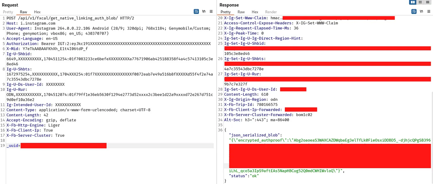 그렇게 되면, 페이스북은 /api/v1/fxcal/get_native_linking_auth_blob/로 POST 요청을 전송하게 되는데, 이를 캡쳐하여 분석해본다.