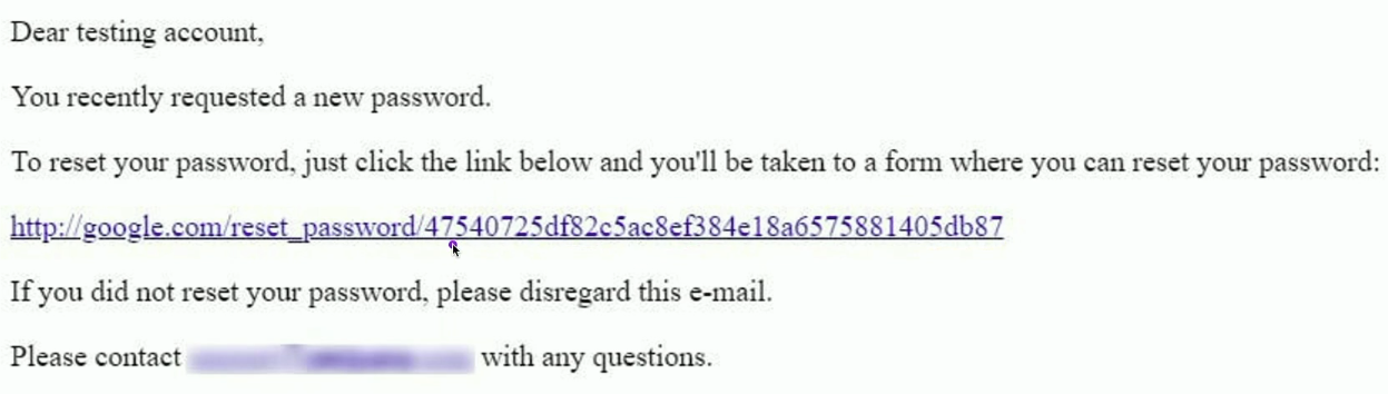 가령, 비밀번호 재설정 페이지에서 공격하고자 하는 이메일로 인증 요청을 보낸 후, 그 패킷을 잡아 Host 헤더에 공격자 서버의 주소를 입력하면 피해자에게 다음과 같은 비밀번호 재설정 이메일이 전송된다.