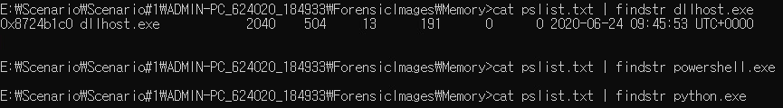 | grep -i "command line" dlllist.txt | findstr powershell.exe grep -i "command line" dlllist.txt | findstr python.exe |