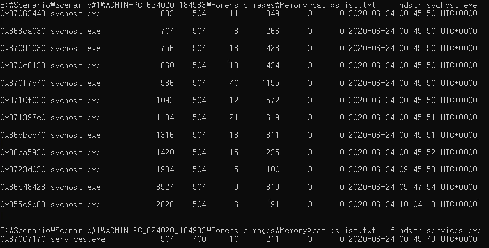 확인 결과, svchost.exe 파일이 전부 동일한 부모 pid, 즉 services.exe 프로세스를 부모로 두고 있는 것을 확인할 수 있다.