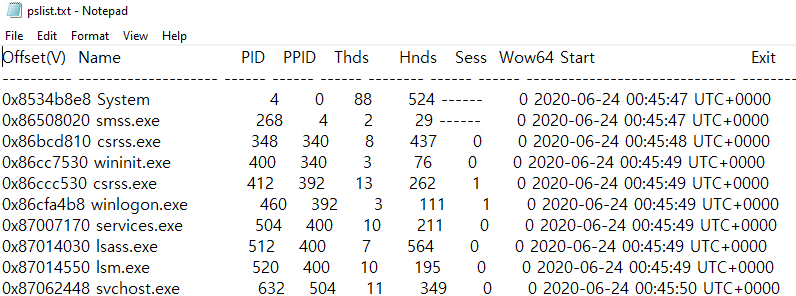 | volatility25 -f memory.raw --profile=Win7SP1x86 pslist > pslist.txt |