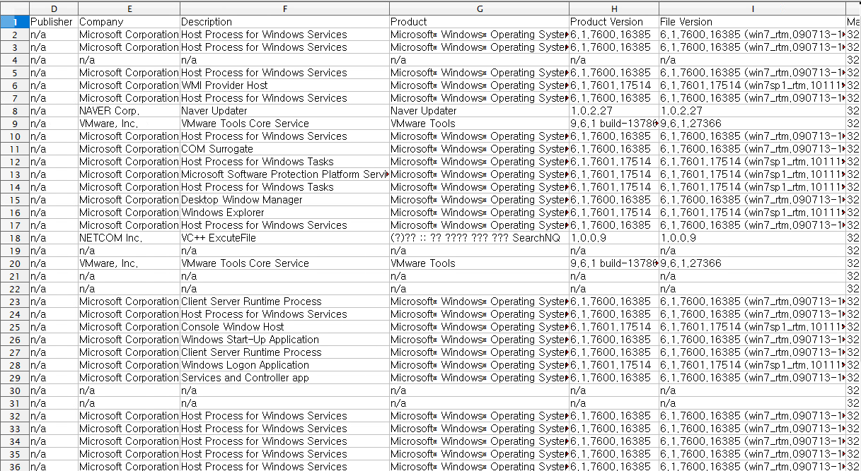 상기 덤프 뜬 프로세스들과, sigcheck.exe 툴을 사용하여 추출한 "sigchesck.csv"를 가지고 분석한다.