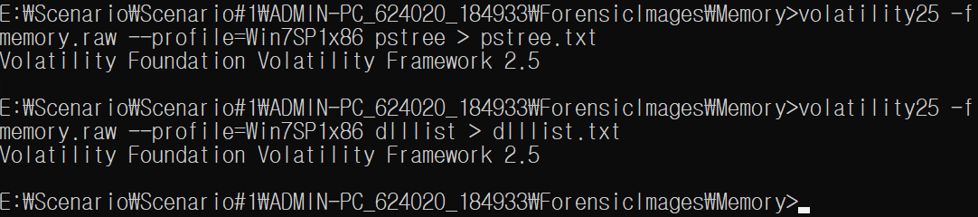 | volatility25 -f memory.raw --profile=Win7SP1x86 pstree > pstree.txt volatility25 -f memory.raw --profile=Win7SP1x86 dlllist > dlllist.txt |