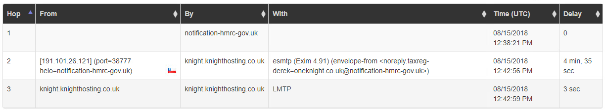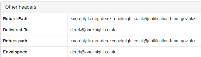 위 사례는 from이 noreply.taxreg@notification-hmrc-gov.uk, to가 derek@oneknight.co.uk로 되어있음