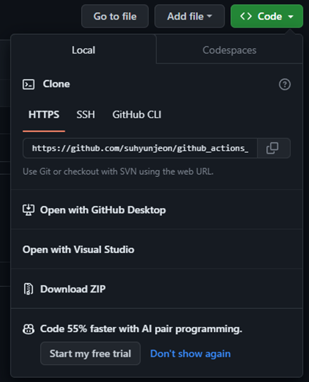 복제를 원하는 레포지토리에 코드 버튼을 누르면 HTTP, SSH, GitHub CLI 3개가 보임
