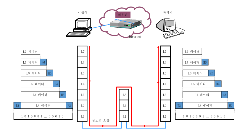 상위계층(7계층)부터 하위 계층으로 내려오면서 계속 진행되며,