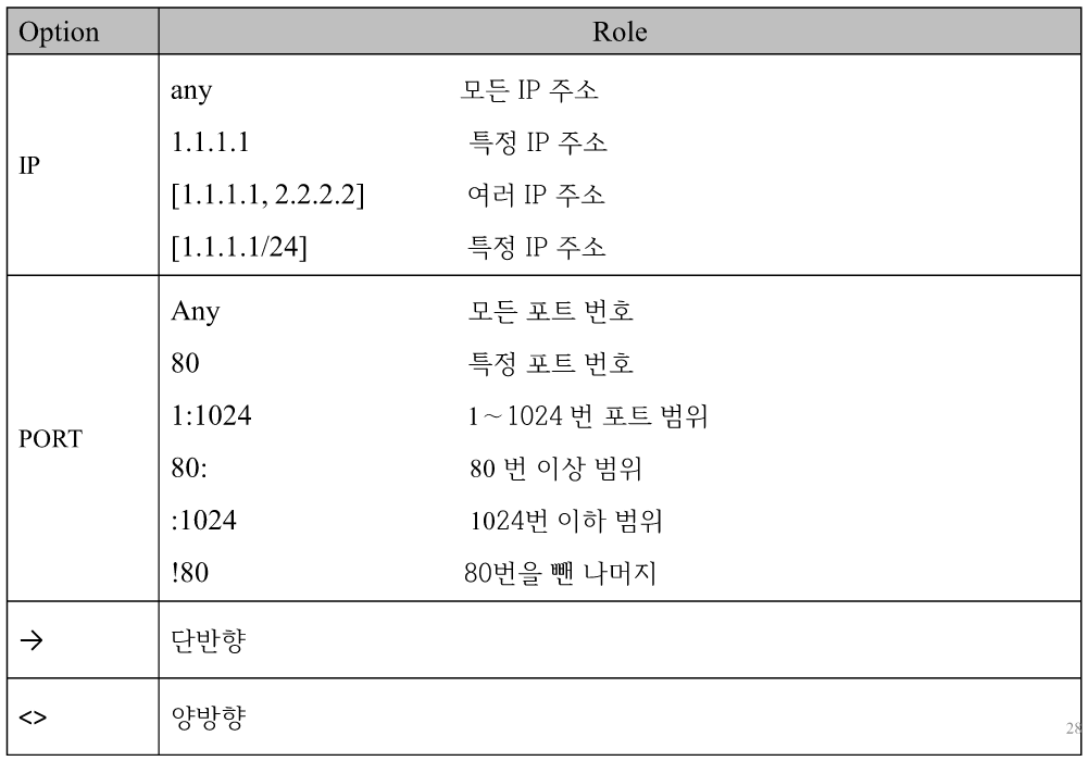 - drop : 패킷을 차단 한 후 로그로 저장한다.