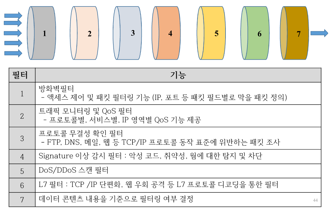 실시간으로 패킷을 탐지하고 차단하는 능력은 탁월하나, 장비에 장애가 발생할 경우 전체 네트워크가 마비되는 단점이 있다.