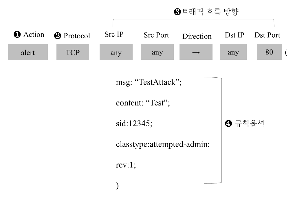 Snort 룰은 기본적으로 규칙 헤더와 규칙 옵션으로 나뉘며, 규칙 헤더는 프로토콜과 트래픽의 흐름 방향을, 규칙 옵션은 규칙의 종류와 규칙의 세부적인 룰을 규명하는 옵션이다.