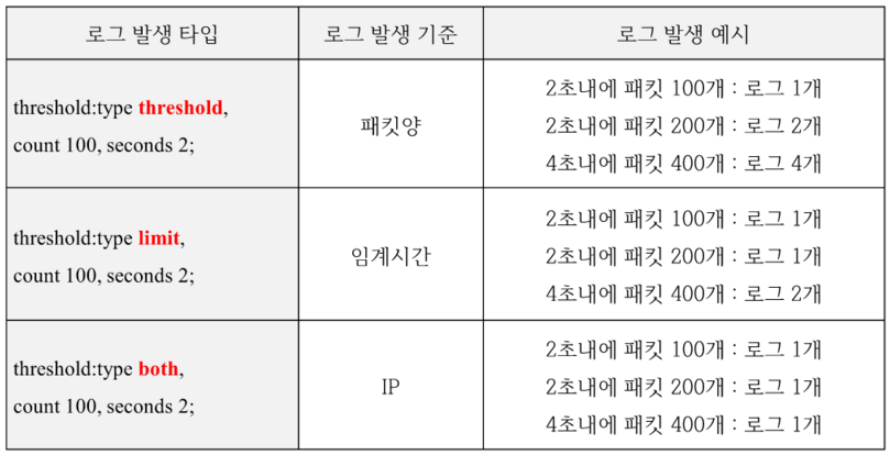 이럴 때 사용하는 것이 threshold 옵션이다. threshold 옵션은 동일한 특정 패킷이 정한 시간동안 일정 갯수 이상 발견이 되면 조건을 충족했다고 설정하는 옵션이다.