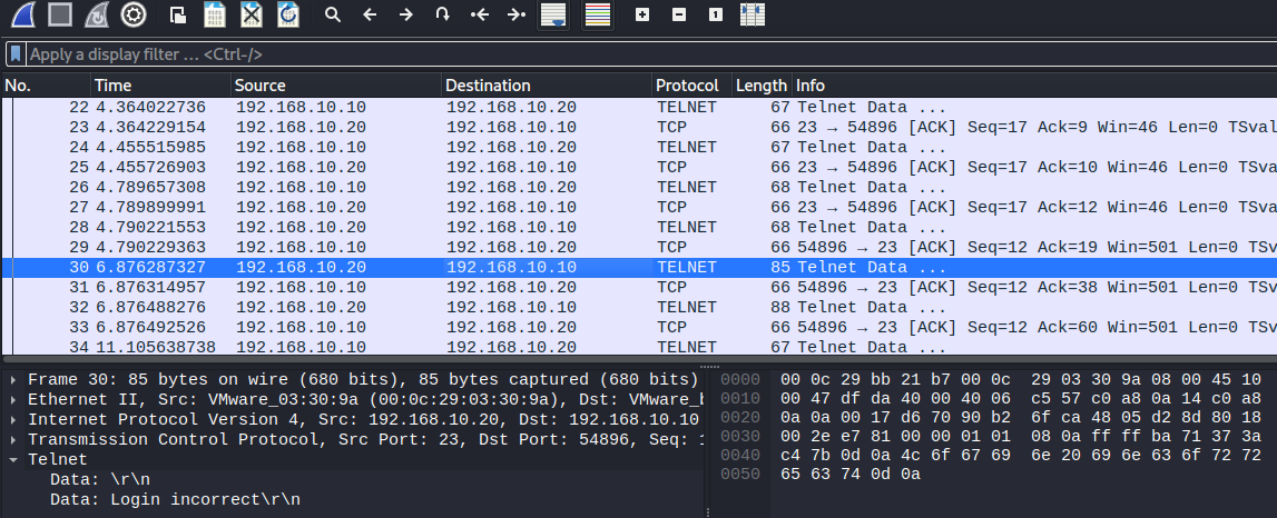 주고 받은 데이터가 그대로 Telnet 항목에 노출되어 있는것을 확인할 수 있다.