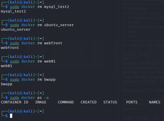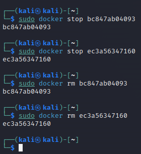현재 모든 컨테이너를 전부 삭제해본다. 삭제는 반드시 중지 후 삭제가 진행되어야함을 명심하자.