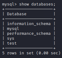 DB를 확인하면, test이름의 DB가 있는게 보인다.