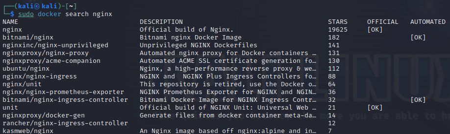 해당 명령어로, nginx 이미지를 볼 수 있다. 이를 통해 현재 이미지 목록, 공식 인증 및 자동화 여부를 파악할 수 있다.