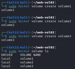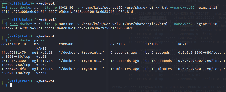 다음 명령어를 사용하여 3개의 웹 서버 컨테이너를 생성하고, 각각에 볼륨과 네트워크를 연결한다.